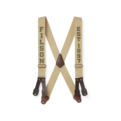 Sometimes it takes more than a belt to keep your cargo in place. These wide elastic suspenders have riveted leather tabs for attaching to suspender buttons and an X-cross design in the back for added durability. Inspired by traditional lumberjack suspenders. each front tab attaches to two buttons while each back tab attaches to one. They feature Filson branding in the front sturdy metal hardware.