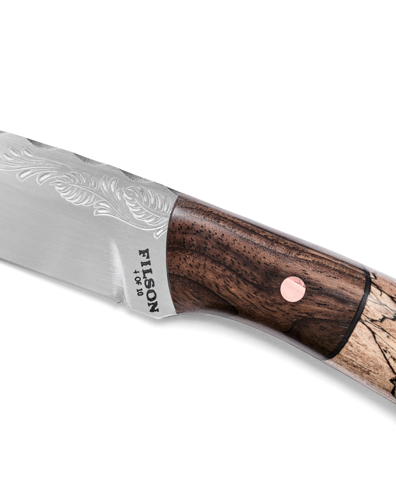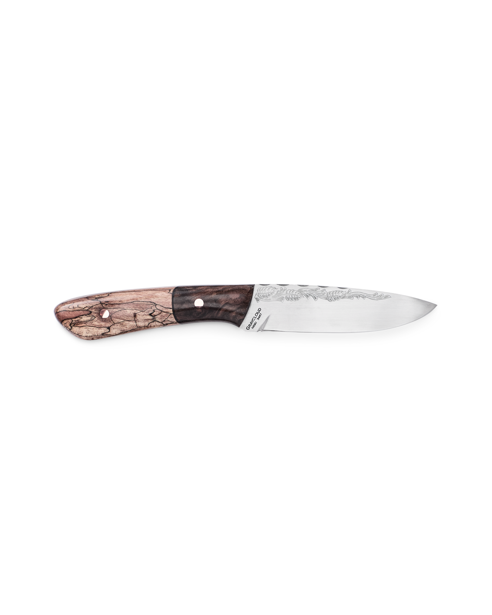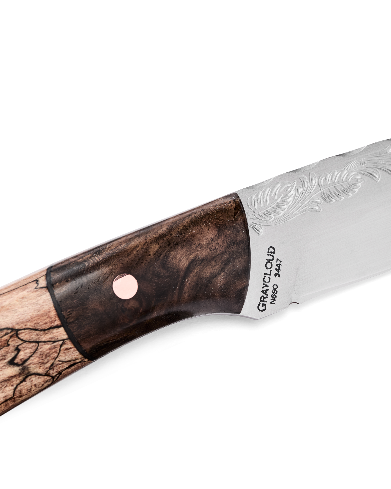 The 4-inch full-tang blade is crafted from sanded Böhler N690 stainless steel that strikes an ideal balance of sharpening ease. edge retention. and corrosion resistance. Its flat grind delivers excellent slicing ability while retaining spine strength. Handles are shaped by hand from walnut burl and spalted maple. each one unique. Copper Corby bolts secure the scales for unfailing durability.