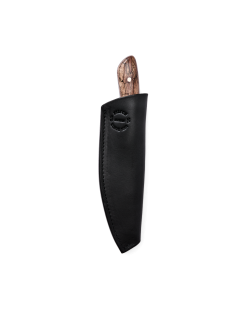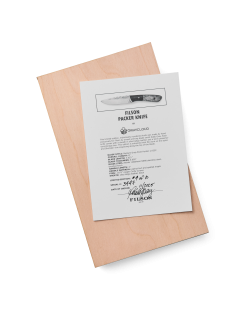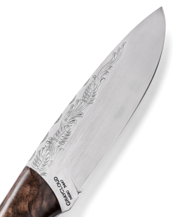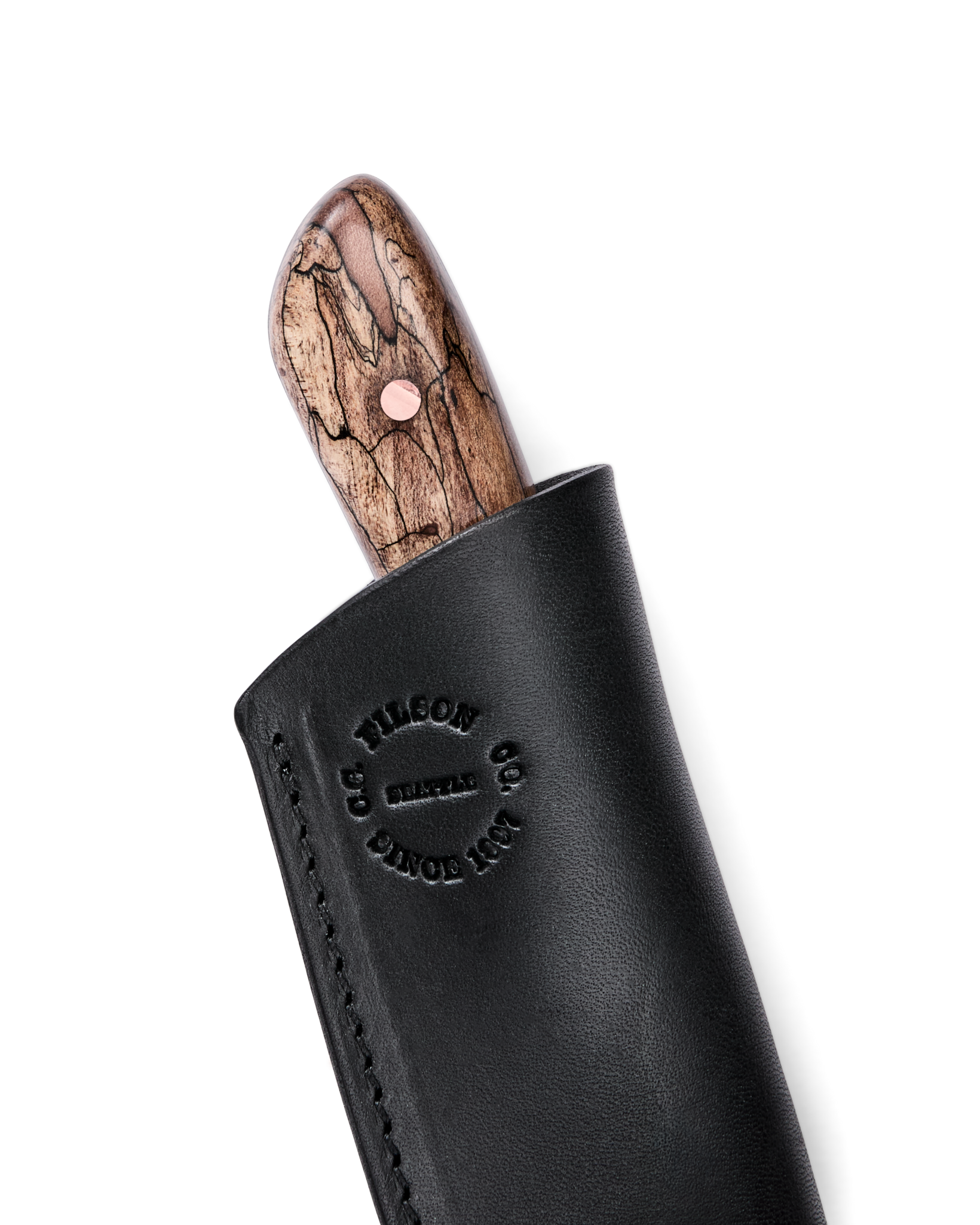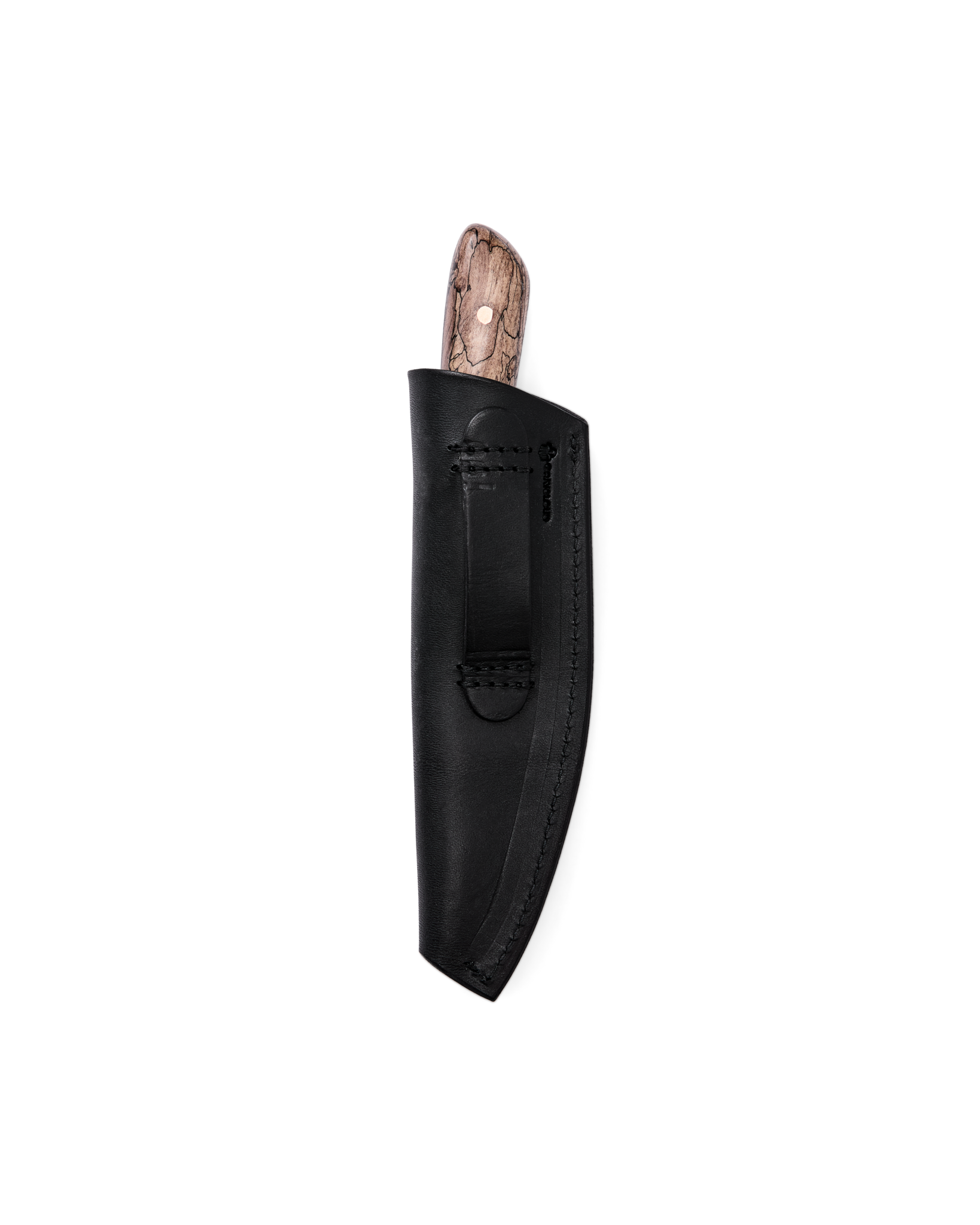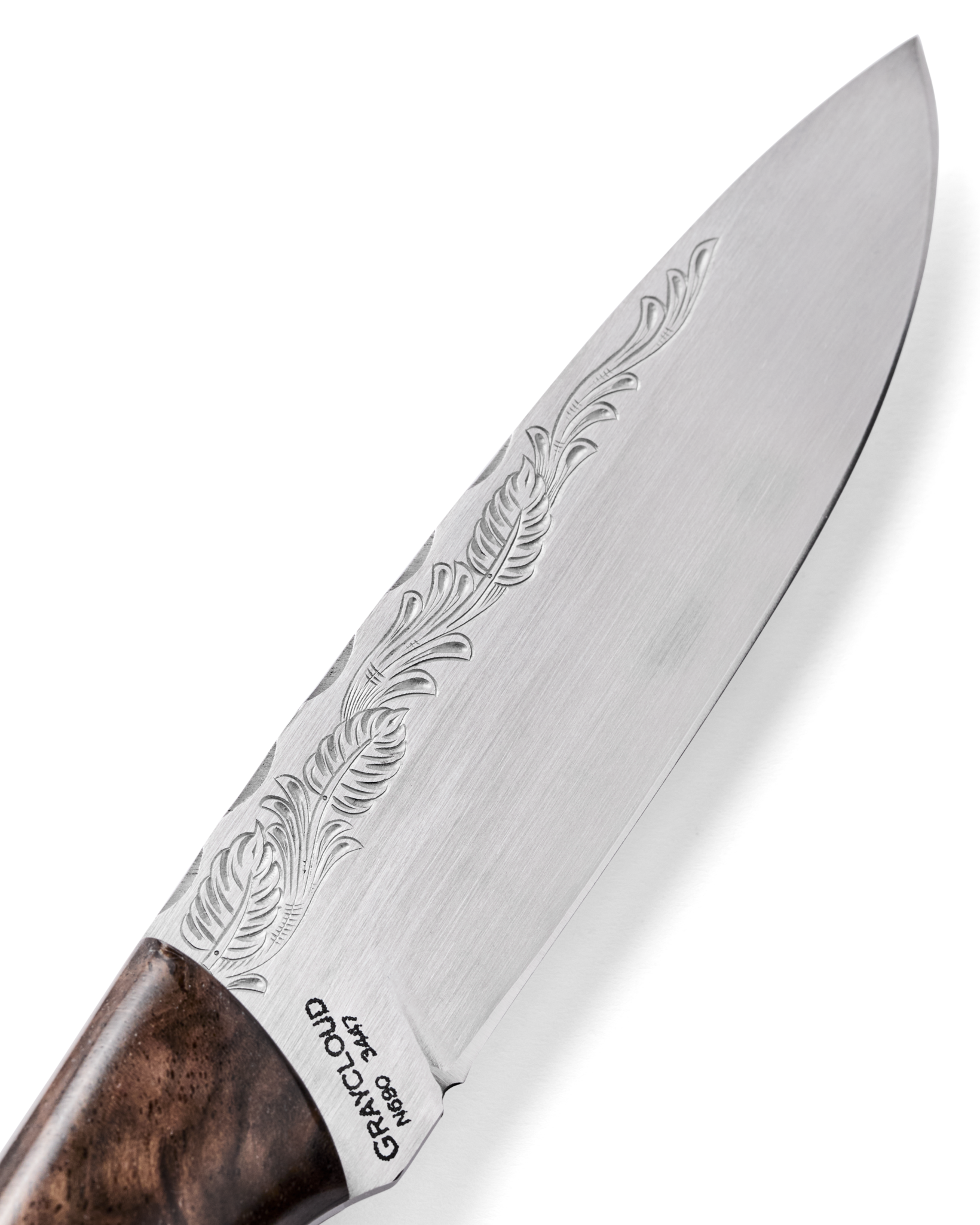 The 4-inch full-tang blade is crafted from sanded Böhler N690 stainless steel that strikes an ideal balance of sharpening ease. edge retention. and corrosion resistance. Its flat grind delivers excellent slicing ability while retaining spine strength. Handles are shaped by hand from walnut burl and spalted maple. each one unique. Copper Corby bolts secure the scales for unfailing durability.