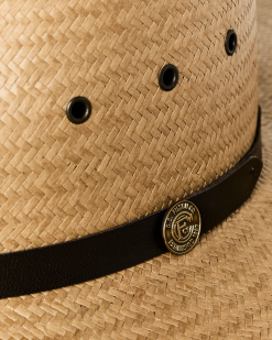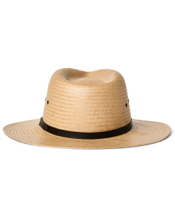 The Straw Baler Hat is made for hot days in the sun. The three-inch brim protects the neck and ears from the sun. The crown shape echoes the design of our classic Packer Hat. with ventilating eyelets along the sides. The hatband is leather with a custom logo badge. and the interior Dri-Lex sweatband wicks moisture away from the skin. Made with Shantung straw for lasting structure.