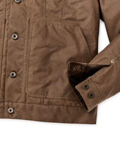The Insulated Short Cruiser is made with our signature Shelter Cloth waxed cotton. At 11-oz. per square yard. this fabric is midweight for Filson. yet still heavier-duty than its imitators. Strong and flexible. Shelter Cloth comes from England’s famed British Millerain. waxed-cotton pioneers since 1880. The PrimaLoft insulation is lightweight and will continue to trap heat even if it gets wet. The collar and cuffs are lined with 100% cotton corduroy for comfort against the skin. Virtually unbreakable metal-shank buttons secure the front closure and waist-adjustment tabs. Large hand pockets plus flapped and slotted chest pockets.
