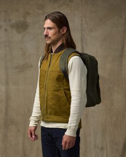Our Journeyman Backpack carries gear comfortably on the trail and is made with waxed Tin Cloth to protect your gear from wet weather. This tightly woven canvas duck has been thoroughly saturated with wax for water resistance. Our industrial-strength Rugged Twill on the back panel and base adds structure and durability. The padded shoulder straps are lined with Moleskin cotton for comfort and to minimize slipping. The straps are secured to the backpack with Bridle Leather that is strong enough for horse saddlery. The main compartment is accessed by a strong brass YKK zipper that extends more than halfway down the bag for easy access. An interior padded pocket fits laptops up to 15. The exterior pocket is expandable for increased capacity.