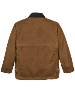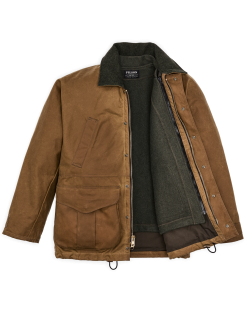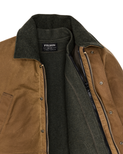 This water-resistant waxed-canvas jacket combines design elements of our proven raincoats with the field functionality of our vintage hunting jackets. It’s made with our signature Tin Cloth waxed canvas. the iconic fabric that’s provided weather protection in the rain-soaked Pacific Northwest forests for a century. The caped shoulder design minimizes seams exposed to driving rain. Dividers in the expandable front pockets were originally designed to separate live and spent shotgun shells. and work just as well for keeping essentials organized. The zippered back pocket is lined with nylon for carrying game or bulky items. The high-set hand pockets and collar are lined with warm Mackinaw Wool. Select Filson liners can be fastened with the interior zipper. Drawcord-adjustable waist and hem.