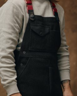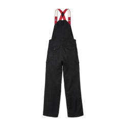 Filson wool bibs have kept outdoorsmen warm in freezing conditions for three decades. The thick 24-oz. wool is made from longest. strongest fleece fibers. The thick yarns are tightly woven into a dense twill fabric that sheds water and wind while remaining highly breathable. Our wool wicks moisture away for evaporation and insulates dry or wet. Mackinaw’s tight weave also provides outstanding durability. often being handed down to the next generation. The relaxed fit of our bibs provides unrestricted ease of motion for active use. The sides are gusseted sides with metal buttons for easy on/off. Flapped cargo pockets on the chest and legs keep essentials close at hand. Elastic suspenders. Unhemmed.