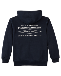 Knitted from 75% cotton with 25% polyester for strength. this durable fabric has a brushed interior for warmth and a smooth exterior that resists pilling. The hem and cuffs are built with a wide and sturdy rib-knit for a custom fit with outstanding stretch and recovery. The generously sized hood easily fits over caps and is drawcord-adjustable for security in the wind. Finished with a front kangaroo pocket and classic Filson logo graphics.