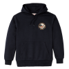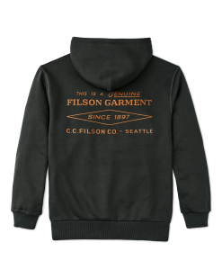 Knitted from 75% cotton with 25% polyester for strength. this durable fabric has a brushed interior for warmth and a smooth exterior that resists pilling. The hem and cuffs are built with a wide and sturdy rib-knit for a custom fit with outstanding stretch and recovery. The generously sized hood easily fits over caps and is drawcord-adjustable for security in the wind. Finished with a front kangaroo pocket and classic Filson logo graphics.