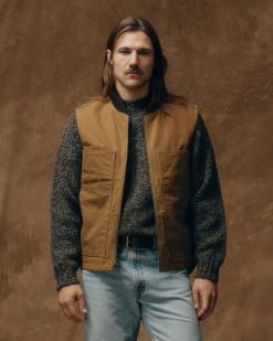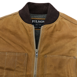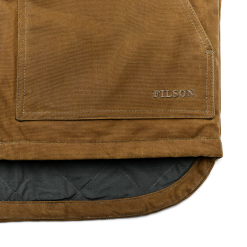This durable vest is made with waxed Tin Cloth. our signature fabric with roots tracing back to the rain-soaked Pacific Northwest forests of the 1920s. The tightly-woven duck canvas presents a nearly impenetrable barrier to thorns. brush. and abrasion. and its waxed finish shrugs off water and mud without flinching. The 60g PrimaLoft® Gold insulation provides lightweight warmth that mimics goose down. but. unlike down. keeps you warm even if it gets wet. The lining is our signature dry finish Cover Cloth for natural comfort. and hem dripped in the back for coverage while bending or climbing. The rib-knit collar is a wool blend. providing a warm feel that only wool can offer. The hand pockets are flannel-lined for warmth. Chest-stow and slotted-utility pockets. Durable metal-zipper front closure.