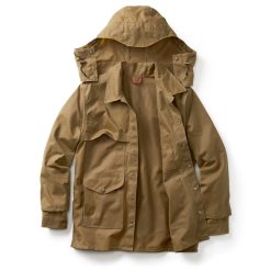 Our water-repellent hood with attached rain-diverting visor buttons into Filson Packer and Logger coats. Two-snap closure protects your neck from wind and driving rain. The wide cut allows for an uncompromised field of vision.