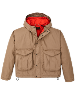 Patterned after our vintage wading jacket from the 1990s. this lightweight jacket is made with a short. waist-length cut. It’s made with seamless caped-shoulder construction to minimize seams exposed to the weather. The Aviator fabric comes from England’s famed British Millerain. experts in rainwear since 1880. The tightly woven cotton is treated with a highly effective water-resistant finish to turn away wet weather. The expandable cargo pockets are oversized like the original design to hold large fly boxes. They are protected by one-hand-operable snaps and have hidden hand packets layered behind them. The hood and hem are drawcord-adjustable for a custom fit. Rib-knit interior cuffs seal out the wind.