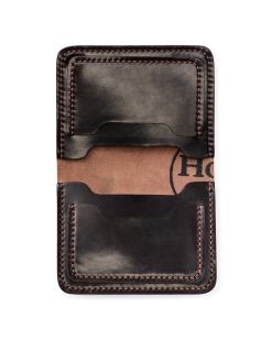 Every wallet is cut. punched. stitched. and burnished entirely by hand. Heavy waxed thread ensures lasting durability. With time and handling. the leather gains a deep patina and polish unique to its owner. On each side is a slot for cards and a larger compartment for folded bills.