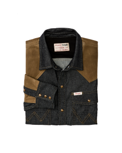 A durable special-edition shirt made from 7.3-oz. denim with a right-hand twist. Denim’s legendary dependability and comfort on ranches. jobsites. and Naval ships has made it a favorite fabric for work and daily wear. The shoulders are made from a washable waxed canvas that adds durability and a bit of water resistance if caught in a shower without a jacket. The back yoke is vented for breathability. and the front is pointed for Western flair. Antiqued bronze snaps secure the front. pocket flaps and cuffs. Forearms are reinforced with the same washable waxed canvas as the yoke. Wrangler’s signature ‘W’ is embroidered on the front pockets.