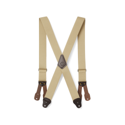 Sometimes it takes more than a belt to keep your cargo in place. These wide elastic suspenders have riveted leather tabs for attaching to suspender buttons and an X-cross design in the back for added durability. Inspired by traditional lumberjack suspenders. each front tab attaches to two buttons while each back tab attaches to one. They feature Filson branding in the front sturdy metal hardware.