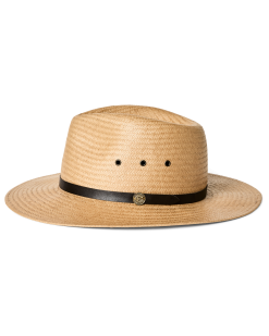 The Straw Baler Hat is made for hot days in the sun. The three-inch brim protects the neck and ears from the sun. The crown shape echoes the design of our classic Packer Hat. with ventilating eyelets along the sides. The hatband is leather with a custom logo badge. and the interior Dri-Lex sweatband wicks moisture away from the skin. Made with Shantung straw for lasting structure.