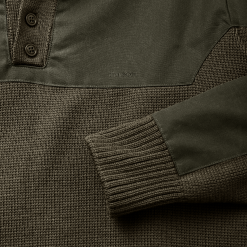 Our Henley Guide Sweater features a cape over the shoulders and arms made from our signature waxed Shelter Cloth. This water-resistant layer provides an added level of protection in wet weather. The sweater is made from 100% merino wool with tightly spun yarns for a firm surface that minimizes pilling and snags. The wool is sourced from U.S. sheep prized for their long. fine fleece. Our merino wool excels at wicking moisture to its tips for evaporation and can absorb up to 30% of its weight in water without feeling damp or clammy. This natural capillary action enables wool to insulate when wet and why it has been the fabric of choice in the outdoors for centuries. Rib-knit collar. cuffs. and hem.