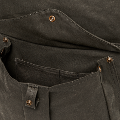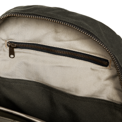 Our Journeyman Backpack carries gear comfortably on the trail and is made with waxed Tin Cloth to protect your gear from wet weather. This tightly woven canvas duck has been thoroughly saturated with wax for water resistance. Our industrial-strength Rugged Twill on the back panel and base adds structure and durability. The padded shoulder straps are lined with Moleskin cotton for comfort and to minimize slipping. The straps are secured to the backpack with Bridle Leather that is strong enough for horse saddlery. The main compartment is accessed by a strong brass YKK zipper that extends more than halfway down the bag for easy access. An interior padded pocket fits laptops up to 15. The exterior pocket is expandable for increased capacity.