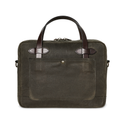Our Tin Cloth Compact Briefcase is padded to protect a laptop or tablet up to 15. The front stow pocket extends the full width of the briefcase for carrying files. and the rear pocket snaps closed to secure contents. The main compartment’s heavy-gauge metal YKK zipper is built for a lifetime of service. The fabric is our signature Tin Cloth. a tightly woven duck canvas that’s been thoroughly saturated with liquefied wax under heat and pressure for maximum water resistance. Tin Cloth’s tight weave provides outstanding resistance to abrasion and punctures without excessive weight. The Bridle Leather handles are thick and strong for lasting service.. The interior is fully lined with cotton Cover Cloth. Detachable. adjustable webbing shoulder strap.