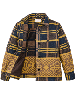 This folky. floral-pattern overshirt insulates like a warm coat. The 82% wool/18% cotton blend provides multi-season comfort and outstanding durability. Made from yarns constructed to maximize loft. the wool fabric is surprisingly lightweight for its thickness. Side-seam hand pockets provide functional utility while staying true to the garment’s design simplicity. Button-close front with spread collar.