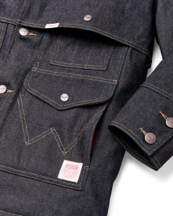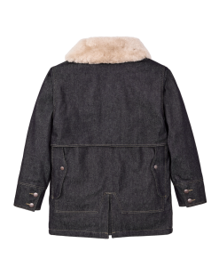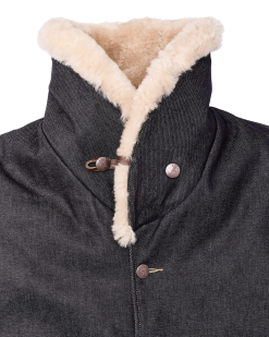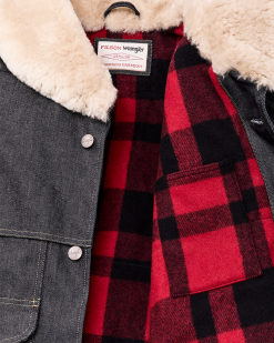 Made with strong 14.5-oz. Wrangler denim. this special-edition Packer Jacket is patterned after our iconic rancher’s coat. The torso is lined with our signature Mackinaw Wool that has provided warmth in the backcountry for more than a century. The sleeves are lined with lightweight PrimaLoft insulation for warmth that slides easily over layers. The sheepskin-shearling shawl collar extends to ear-height for warmth in biting wind and cold. Four front cargo pockets are covered by snapped flaps. and the full-width back packet is large enough for bulky items. Virtually unbreakable metal buttons secure the front and cuffs. Signature Wrangler embroidery on the pockets. Fingertip-length.