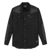 A durable special-edition shirt made from 7.3-oz. denim with a right-hand twist. Denim’s legendary dependability and comfort on ranches. jobsites. and Naval ships has made it a favorite fabric for work and daily wear. The shoulders are made from a washable waxed canvas that adds durability and a bit of water resistance if caught in a shower without a jacket. The back yoke is vented for breathability. and the front is pointed for Western flair. Antiqued bronze snaps secure the front. pocket flaps and cuffs. Forearms are reinforced with the same washable waxed canvas as the yoke. Wrangler’s signature ‘W’ is embroidered on the front pockets.